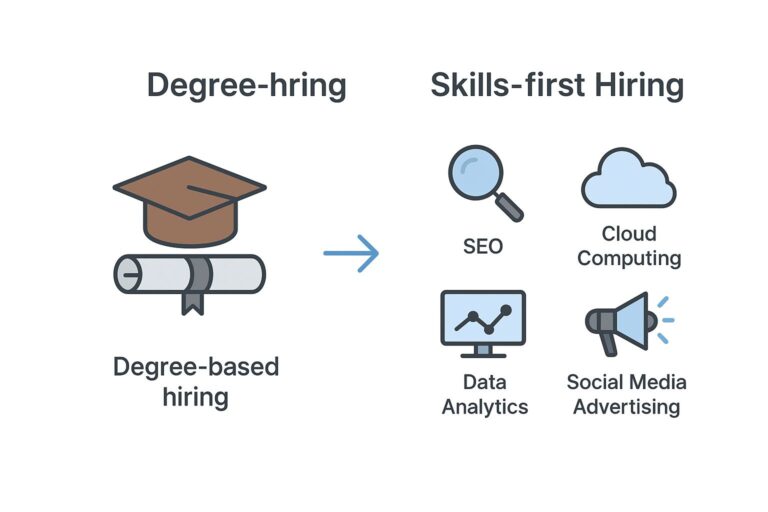 This context sets the stage for a critical paradigm shift in human capital management: skills-first hiring. This approach recognizes that, in a fast-changing environment, degrees and traditional credentials are no longer sufficient indicators of job readiness. Instead, tangible skills and competencies—demonstrated through experience, training, or certification—are what employers increasingly seek.